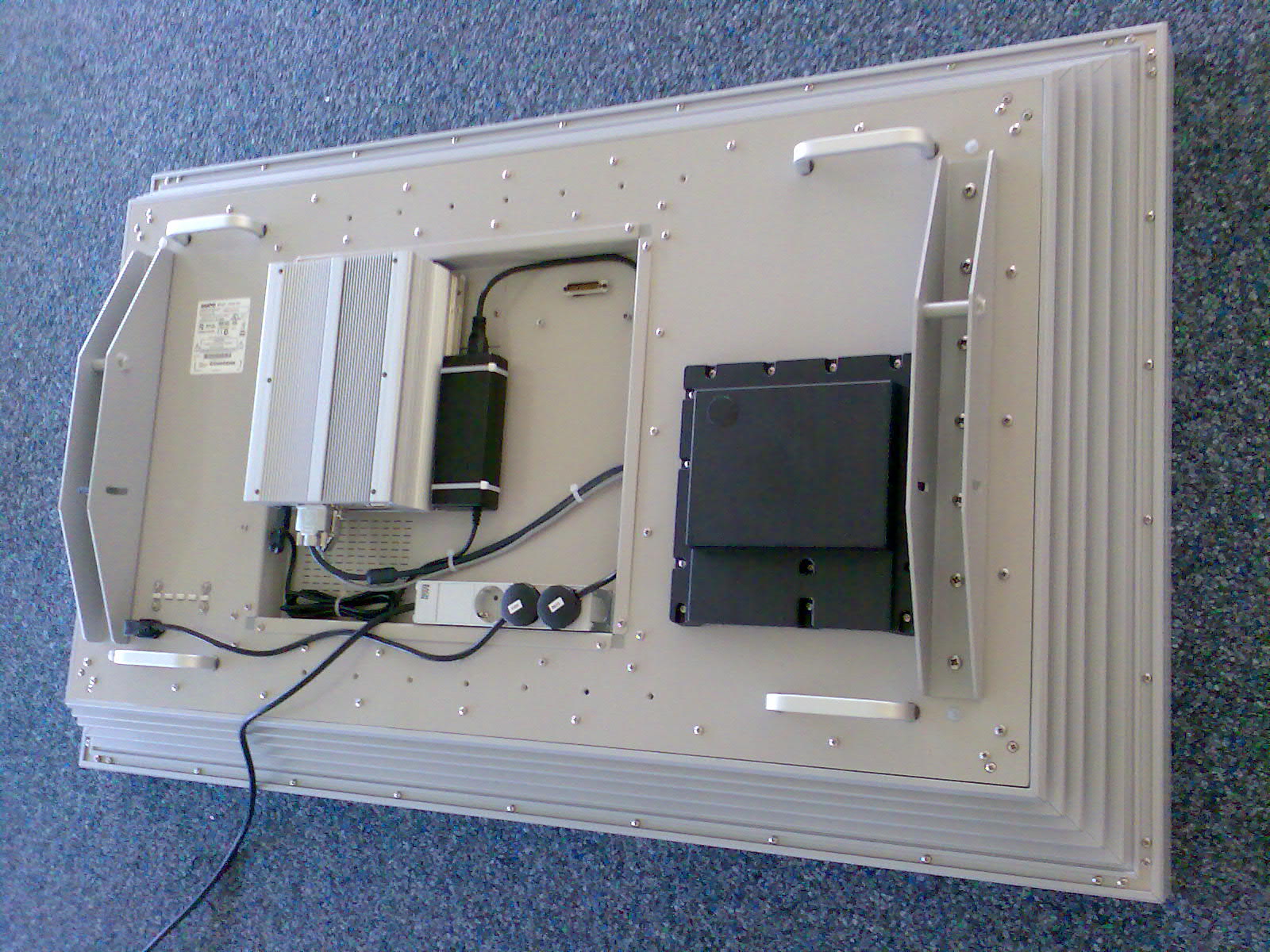Rechtes Bild: Rückansicht eines 132cm-Bildschirms in staubdichter Ausführung. Das Steuergerät wurde fest an der Rückseite des Bildschirm befestigt.